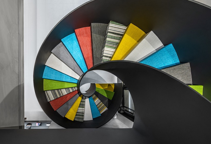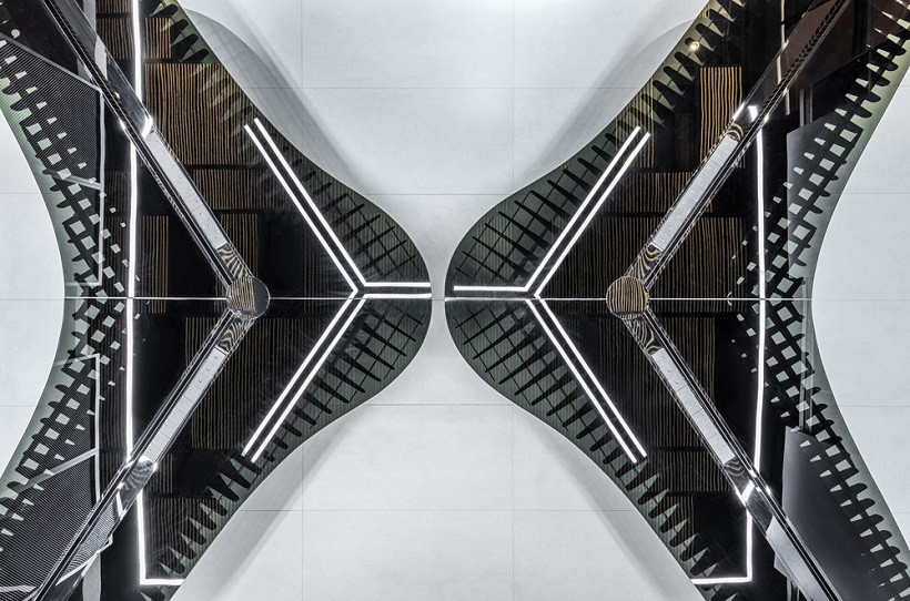 Los paneles de acero negro forman la unidad curvilínea y las capas de formas geométricas se distorsionan y dividen como una morfología orgánica de un bar de agua, un escritorio de información y una larga mesa de comedor. El escritorio de trabajo del segundo piso combina las juntas de madera con los paneles de acero. La estructura parece una mariposa que parece ligera y pesada al mismo tiempo. La forma simétrica facilita la circulación fluida del flujo de trabajo.