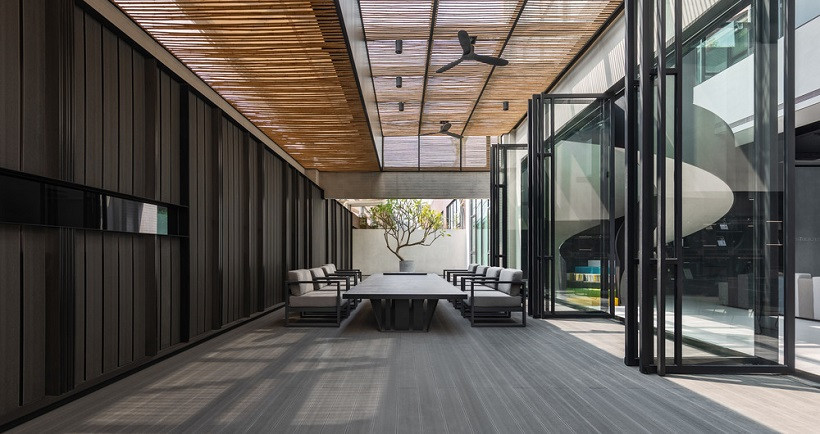 2 El trabajo como la vida: La sensación de relajación se ve aumentada por el estanque, el verdor exterior, la cocina y la mesa de comedor interior con paneles de bambú en el techo.